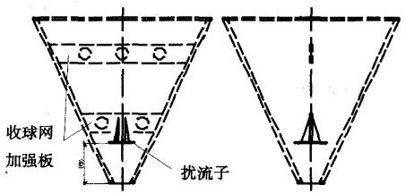 (3)經(jīng)過與廠家協(xié)商,為克服循環(huán)水出口壓力偏高造成的膠球在收球網(wǎng)內(nèi)的強(qiáng)烈旋轉(zhuǎn),如圖2所示,在膠球清洗裝置內(nèi)部加裝擾流子,要求擾流子材質(zhì)為Q235,擾流子和收球網(wǎng)加強(qiáng)板要可靠地焊接。以降低凝汽器循環(huán)水出口的壓力及膠球在收球網(wǎng)內(nèi)部的旋轉(zhuǎn)強(qiáng)度,從而使膠球順利地落入收球網(wǎng)底部,及時(shí)送入收球泵入口管道。