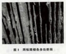 膠球清洗裝置的收球網(wǎng)安裝位置上游直管段長度大于循環(huán)水管直徑的3倍,以避免循環(huán)水流場對(duì)收球網(wǎng)的干擾。收球網(wǎng)直接安裝在凝汽器出水口彎管段下游,容易造成A側(cè)膠球清洗裝置收球網(wǎng)網(wǎng)板(簡稱網(wǎng)板)積球;網(wǎng)板隔柵條多處斷裂并扭曲變形,導(dǎo)致膠球可從隔柵條空隙中擠出,影響裝置收球率;由于網(wǎng)板本身缺陷造成與殼體周邊間隙過大會(huì)導(dǎo)致漏球(圖1、圖2)。