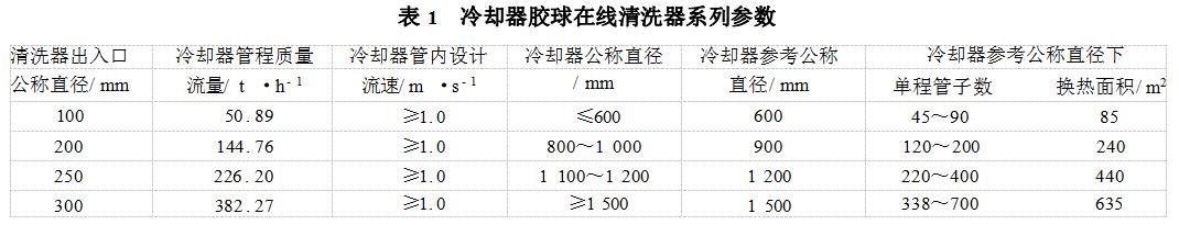 冷凝器自動(dòng)在線(xiàn)膠球清洗裝置系列的主要參數(shù)見(jiàn)表1。值得一提的是該項(xiàng)清洗技術(shù)在煉油化工裝置中塔頂冷凝器系統(tǒng)的使用效果十分顯著,可免除生產(chǎn)過(guò)程中由于冷凝器結(jié)垢而引起的氣體介質(zhì)冷凝效率下降、塔頂氣體壓力升高,進(jìn)而影響裝置的安全生產(chǎn)和產(chǎn)品產(chǎn)量與質(zhì)量等問(wèn)題。