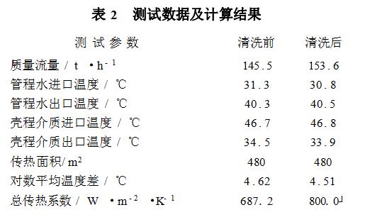 2003年6月在某煉油廠(chǎng)氣分裝置選擇脫丙烷塔1組2臺(tái)串聯(lián)塔頂冷凝器(該部位共計(jì)3組6臺(tái)冷凝器),其型號(hào)為FLB900-240-25-Ⅱ(B=200),管程介質(zhì)為循環(huán)水,進(jìn)口溫度為28~32℃,出口溫度為40~42℃,操作壓力為0.45MPa,質(zhì)量流量為150×103kg/h;殼程介質(zhì)主要為C2+C3,進(jìn)口溫度48~50℃,出口溫度為46~47℃,操作壓力為1.95MPa,質(zhì)量流量25×103kg/h。在1組2臺(tái)串聯(lián)冷凝器管、殼程出入口管線(xiàn)上分別安裝精密水銀溫度計(jì)及超聲波流量計(jì),通過(guò)測(cè)試?yán)鋮s器清洗前、后冷卻器管、殼程出入口介質(zhì)溫度和流量數(shù)據(jù),計(jì)算出總傳熱系數(shù)的變化,以檢驗(yàn)清洗效果。其測(cè)試的平均結(jié)果見(jiàn)表2。