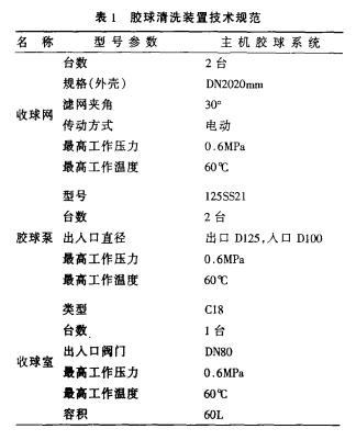 山西電廠捷制500MW機(jī)組主機(jī)凝汽器配套的膠球清洗裝置包括活動式收球網(wǎng)、膠球泵、裝球室、膠球再循環(huán)管路、膠球再噴射裝置、膠球再循環(huán)監(jiān)督裝置和差動壓力測量系統(tǒng)等。其作用是在機(jī)組運(yùn)行過程中,供助水流將海綿膠球擠過凝汽器銅管,并不斷循環(huán),擦洗掉銅管內(nèi)的垢物,提高熱交換效率,降低凝汽器端差,提高汽輪機(jī)組真空.技術(shù)規(guī)范見表1。
