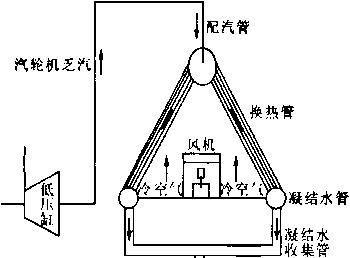 冷凝器膠球清洗裝置系統凝汽器結構主要分為上下兩部分,下部為支撐設施,上部為熱交換裝置(圖1)。熱交換裝置分多個熱交換單元,圖2為一個熱交換單元的結構。每個熱交換單元由1根配汽管和2根凝結水管圍成三角形,側面用截面為橢圓形的換熱管連接配汽管和凝結水管;相鄰二根換熱管間裝有褶皺形散熱片,它們緊密排列成二個側面。熱交換單元的換熱示意見圖3。