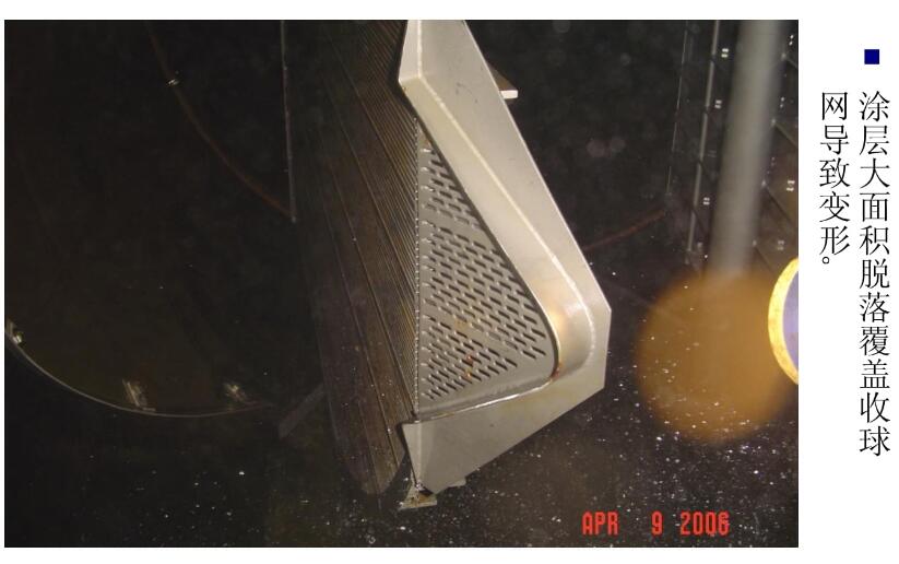 2.收球網(wǎng)變形,凝汽器水室涂層脫落,大面積覆蓋在收球網(wǎng)上,導(dǎo)致收球網(wǎng)變形。