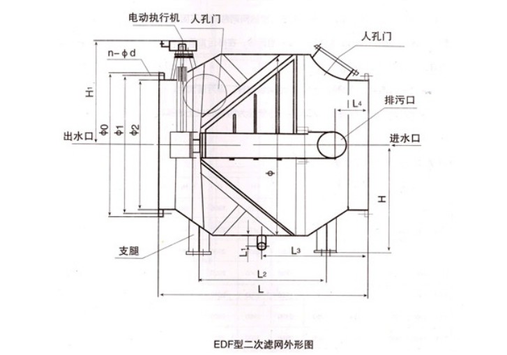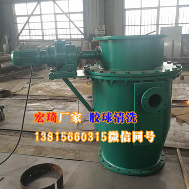 膠球清洗裝置系統(tǒng)二次濾網(wǎng)主要由濾網(wǎng)、外殼、蝸輪箱體、排污槽、傳動軸、排污口和電驅(qū)動等組成。