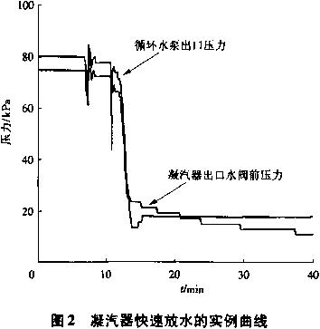 凝汽器快速放水的缺點(diǎn)是:可能會產(chǎn)生循環(huán)水泵倒轉(zhuǎn)的情況,由于循環(huán)水泵葉輪一般是采用套裝的軸套,上有絲扣擰在軸上,擰的方向與軸轉(zhuǎn)動方向相反。所以,當(dāng)泵順轉(zhuǎn)時(shí),就愈擰愈緊,如果反轉(zhuǎn)就容易使軸套退出,葉輪松動會產(chǎn)生摩擦。另外,循環(huán)水泵葉輪兩側(cè)的軋?zhí)m填料也存在同樣情況,反轉(zhuǎn)可能會使填料松動,漏水。單位3套S109FA機(jī)組循環(huán)水系統(tǒng)多次試驗(yàn)中快速放水時(shí),在沒有釆用限流措施的情況下(凝汽器水側(cè)自動透氣閥全開,循環(huán)水泵的出口液控蝶閥全開),現(xiàn)場也未見循環(huán)水泵倒轉(zhuǎn)。再例:由于凝汽器兩側(cè)出水閥關(guān)閉不嚴(yán),按正常方式放水,整整24h,也未將水放盡,后通過凝汽器快速放水法,15min解決問題。所以,當(dāng)采用限流措施快速放水時(shí),應(yīng)該更安全,只要確保凝汽器兩側(cè)出水閥可靠關(guān)閉即可,實(shí)際快速放水實(shí)例曲線如圖2所示。