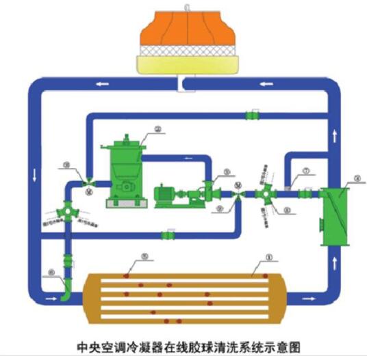 膠球清洗裝置{中央空調(diào)冷凝器自動在線膠球清洗裝置}系統(tǒng)原理:其基本原理就是借助水流的作用,將濕態(tài)直徑稍大于冷凝管內(nèi)徑的膠球