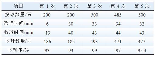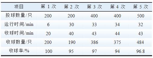收球網板處于收球位置,將準備好的膠球投入裝球室,該室處于收球位置,打開裝球室出口隔離球閥后,開啟膠球泵,再打開膠球泵出口電動球閥,數分鐘后投球循環運行、收球并記錄數據。試驗時,凝汽器出口壓力4.2kPa;膠球泵進口壓力9.2kPa,出口壓力12kPa。2號機外環膠球清洗裝置系統5次試驗數據見表4所示。